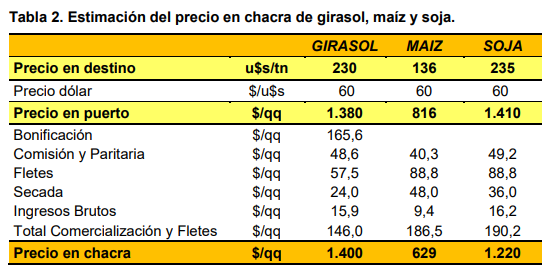 A continuación, se muestran en forma comparativa, el precio en chacra percibido por el productor y los resultados económicos de los cultivos de girasol, maíz y soja (Tablas 2 y 3)