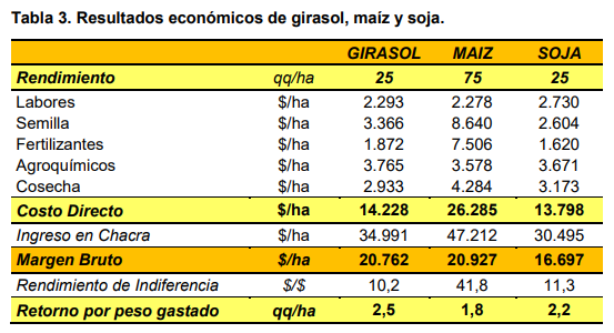 Comparando los resultados económicos, se puede observar que el maíz es el cultivo que presenta el mayor margen bruto, seguido por el girasol y luego la soja. Sin embargo, el maíz presenta el menor retorno a la inversión, ya que requiere mayores costos de implantación, protección y cosecha. La soja es el cultivo que requiere los menores gastos para su implantación entre las alternativas analizadas. De esta forma, la oleaginosa presenta costos directos que son un 3% menor a los de girasol y un 48% menor a los de maíz.