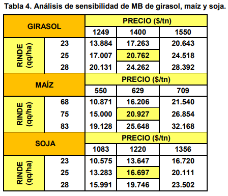 Teniendo en cuenta las posibles variaciones en rendimiento que puedan obtenerse debido a efectos climáticos y otras situaciones particulares, y la evolución de los precios esperados, se realizó un análisis de sensibilidad del Margen Bruto considerando un rango de valores para rendimientos y precios (Tabla 4).