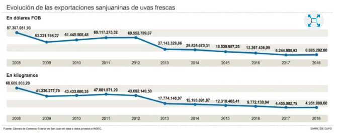 Cuando todavía no están los números finales, la temporada de exportación de uva en fresco, un negocio en el que San Juan es líder en el país, cerrará con un volumen estimado en los 4 millones de kilos, el más bajo de los últimos 12 años, según fuentes de la actividad, y un 18% inferior a la temporada pasada, que cerró con la salida de 4,9 millones de kilos. En esta situación tiene que ver la falta de competitividad, causada por los elevados costos internos, fletes y energía caros, servicios de exportación elevados, a lo que se suma la fuerte presión impositiva. Incluso mencionan que si bien el tipo de cambio es más elevado, con un dólar que supera los 40 pesos, los productores sufren por la aplicación de retenciones y quita de reintegros.