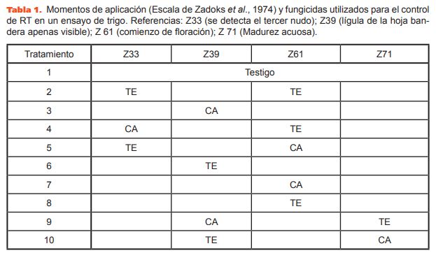 Se usó una variedad muy susceptible a RT, moderadamente susceptible a Roya de la Hoja (RH) (Puccinia triticina) y que ha tenido una amplia difusión en la zona (Baguette 601). Los fungicidas utilizados estaban formulados en base a fluxapyroxad 5% + epoxyconazole 5% + pyraclostrobin 8,1% (CA) y el otro con Ciproconazol 8% + Azoxistrobin 20% (TE). Los tratamientos se describen en la Tabla 1.