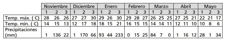 Tabla 1. Precipitaciones y temperaturas máximas y mínimas registradas durante el ciclo del cultivo. Fuente: Estación Agrometereológica EEA INTA Pergamino.