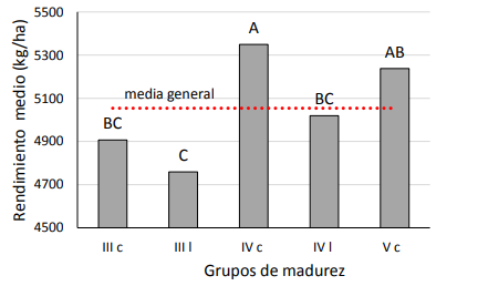 Gráfico 1. Rendimiento promedio (kg/ha) según los grupos de madurez. Letras distintas indican diferencias significativas entre los grupos de madurez. La línea punteada corresponde a la media general del ensayo.