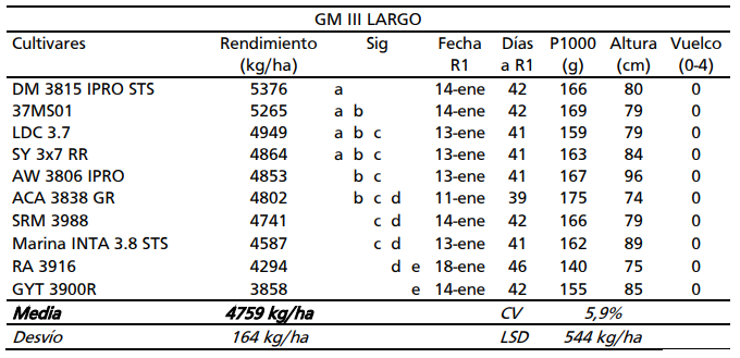 Tabla 3. Rendimiento, fecha de floración, días desde emergencia a floración, P1000, altura de plantas y vuelco de los cultivares del grupo de madurez III largo. Letras distintas indican diferencias significativas entre los cultivares.