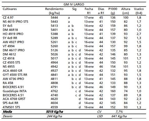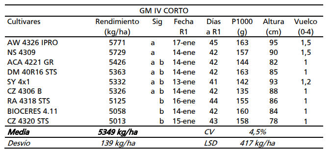 Tabla 4. Rendimiento, fecha de floración, días desde emergencia a floración, P1000, altura de plantas y vuelco de los cultivares del grupo de madurez IV corto. Letras distintas indican diferencias significativas entre los cultivares.