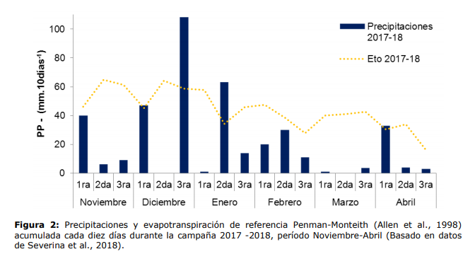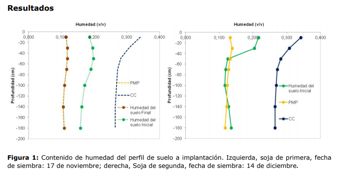 En ambientes de secano y sin influencia de napa freática, la oferta hídrica para los cultivos está dada por las reservas de agua en el perfil de suelo explorado por las raíces a la siembra más las precipitaciones ocurridas durante el ciclo y los aportes o perdidas por escurrimiento (Dardanelli et al., 2003). A la siembra de los ensayos de primera, el suelo contenía 127mm (38% de agua útil) hasta los dos metros de profundidad, que fueron consumidos completamente durante el ciclo de cultivo (figura 1, izquierda). Por otra parte, a la siembra de los ensayos de soja de segunda, debido al consumo realizado por el cultivo anterior, el suelo contenía 37mm en los primeros 40cm y completamente seco en profundidad (Figura 1, derecha). 4 Las precipitaciones durante la campaña 2017-18 fueron menores a las históricas, totalizando desde noviembre a marzo 349mm (539mm de media histórica), y con un marcado déficit respecto a la evapotranspiración de referencia durante los meses de febrero y marzo (figura 2).