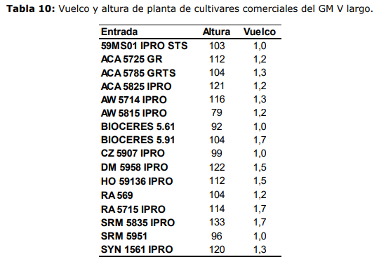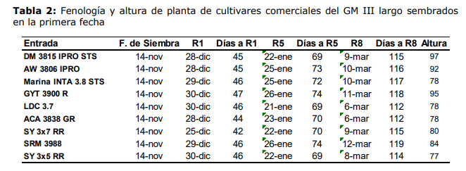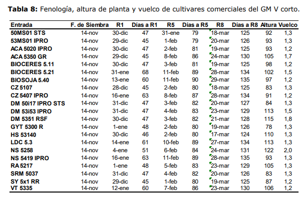 La duración media del ciclo de los cultivares de GM V corto fue de 129 días (rango: 124-135 días) y tuvieron una altura media de 98 cm (rango: 83 – 122 cm).