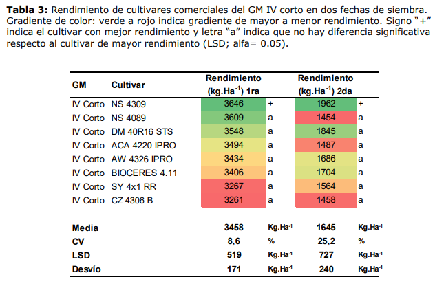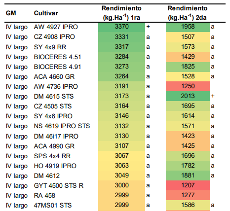 Tabla 5: Rendimiento de cultivares comerciales del GM IV largo en dos fechas de siembra. Gradiente de color: verde a rojo indica gradiente de mayor a menor rendimiento. Signo “+” indica el cultivar con mejor rendimiento y letra “a” indica que no hay diferencia significativa respecto al cultivar de mayor rendimiento (LSD; alfa=0.05).