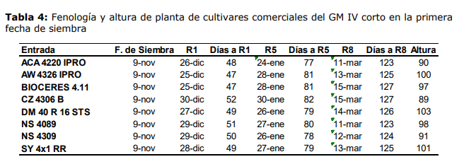 Los cultivares de GM IV corto tuvieron una duración media del ciclo de 125 días (rango: 123- 127 días) y una altura media de 96 cm (rango: 89 – 103 cm).