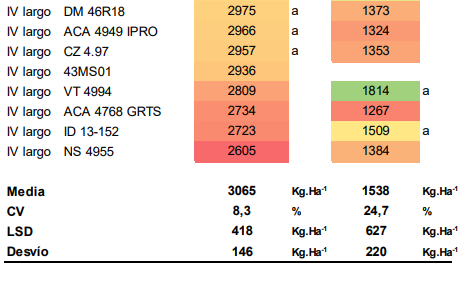 El ensayo de mayor rendimiento fue el IV corto sembrado en noviembre con una media de 3458 kgha-1, y un rango de 3261 KgHa-1 a 3646 KgHa-1. En soja de segunda la media de rendimiento bajó a 1645 KgHa-1. En ambos ensayos no hubo diferencias significativas de rendimiento entre cultivares.