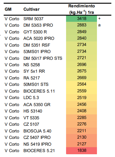Tabla 7: Rendimiento de cultivares comerciales del GM V corto. Gradiente de color: verde a rojo indica gradiente de mayor a menor rendimiento. Signo “+” indica el cultivar con mejor rendimiento y letra “a” indica que no hay diferencia significativa respecto al cultivar de mayor rendimiento (LSD; alfa=0.05).