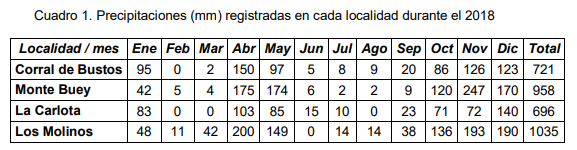 En todas las localidades se evaluaron variedades que participan en la RET del INASE en las fechas de siembra recomendadas por los criaderos. En la primera época se sembraron los cultivares de ciclo largo e intermedio a largo y en la segunda época los cultivares de ciclo más corto. Los ensayos se sembraron con parcelas chicas en lotes de trigo con antecesor soja de primera, en todos los casos lotes provenientes de una rotación trigo/soja de segunda-maíz-soja de primera. Los suelos no presentan limitaciones y en LM tienen pendiente, mientras que entre CB, MB, y LC sólo cambia la serie de suelo. El diseño estadístico utilizado en la siembra de los ensayos fue un alfa látice con tres repeticiones. La unidad experimental aplicada en la siembra fue parcelas de 7 surcos a 20 cm, y una superficie a cosecha de 6 m2 . Las parcelas fueron sembradas con una máquina experimental (Agrometal), mientras que la cosecha se realizó con una cosechadora automotriz de parcelas (Wintersteiger Classic). El manejo de cultivo en todos los casos fue el utilizado por el productor en cada lote. No se observó la incidencia de malezas ni insectos, y se aplicó fungicida cuando el lote del productor lo requirió. En CB la fecha y densidad de siembra para las variedades de ciclo más largo fue el 05/06 con una densidad de 250 plantas/m2 , mientras que para las variedades de ciclo más corto la fecha de siembra fue el 12/07 con 330 plantas/m2 (estas densidades de siembra se utilizaron en todos los ensayos). En CB la fertilización se realizó con 280 kg/ha de UREA más 70 kg/ha de Sulfato de amonio y 110 kg/ha de fosfato mono amónico todo al voleo antes de la siembra, y con 90 kg/ha de fosfato mono amónico al costado del surco en el momento de la siembra. En LM la fecha de siembra temprana fue el 07/06 y la tardía el 12/07, se fertilizó en pre siembra con 380 litros/ha de Sol Mix (80-20) incorporados hacia fines de mayo, y 90 kg/ha de fosfato mono amónico al costado del surco en el momento de la siembra. En MB la fecha de siembra temprana fue el 05/06 y la tardía el 10/07, y para la fertilización el 28 de abril se voleó 270 kg/ha de una mezcla (70% FMA y 30% sulfato de amonio), luego se incorporó 198 kg/ha de urea en pre siembra (30 de mayo) con 90 kg/ha de fosfato mono amónico al costado del surco en el momento de la siembra. En LC la fecha de siembra temprana fue el 04/06 y la siembra tardía fue el 11/07, la fertilización se realizó con 270 kg/ha de UREA incorporada en pre siembra y 90 kg/ha de fosfato mono amónico al costado del surco en el momento de la siembra. El año agroclimático para trigo durante 2018 en la región se inició con una buena recarga de agua en el suelo, en general con las lluvias de abril y mayo, y que en algunas situaciones con influencia de napa, dificultaron la siembra. El aporte de precipitaciones durante el invierno fue muy escaso hasta el momento de espigazón, algo esperable para la región. Las lluvias importantes recién aparecieron hacia fines de octubre. Las temperaturas fueron moderadas a bajas durante gran parte del ciclo de cultivo, con alta ocurrencia de heladas. El 2 de octubre se registró una helada de magnitud poco frecuente para la región que ocasionó daños de importancia en tallos y espigas. El daño fue más importante en una franja central de los departamentos Marcos Juárez y Unión en la provincia de Córdoba. La imagen satelital permite visualizar la región afectada (http://sepa.inta.gob.ar/productos/eventos_extremos/heladas/). En los lotes donde el cultivo de trigo estaba más adelantado el daño fue mayor como así también la pérdida de rendimiento. Luego las condiciones de llenado de grano postergadas en el tiempo permitieron alcanzar en general un aceptable peso hectolítrico con alto contenido proteico (datos no presentados). No obstante estas condiciones, la calidad comercial no presentó problemas. En el cuadro 1 se presentan los registros de lluvias en cada localidad.