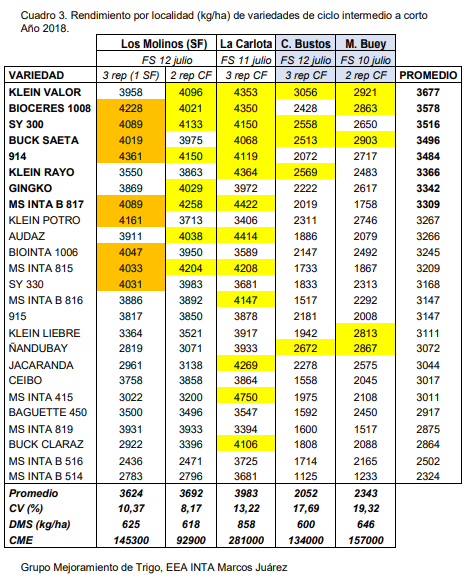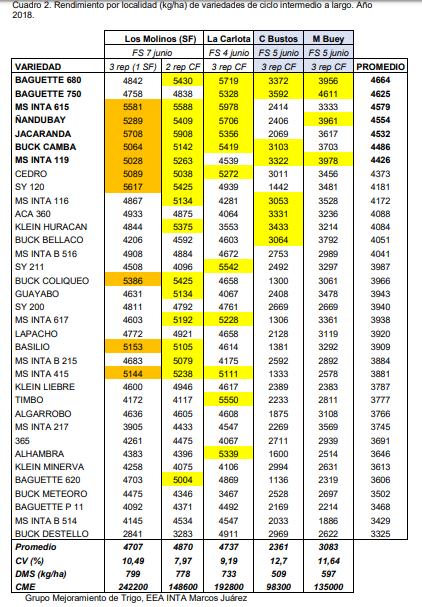 En los cuadros 2 y 3 se presentan los resultados de rendimiento en grano de los ensayos realizados durante 2018 en campo de productor. En los cuadros las variedades están ordenadas por el promedio de rendimiento alcanzado en las cuatro localidades que se cosecharon los ensayos, y se destacan con sombreado los rendimientos más altos en cada sitio de evaluación. Los rendimientos fueron similares a los alcanzados en la región. Entre las variedades de ciclo intermedio y largo se destacaron por su rendimiento promedio superior a los 4400 kg/ha las variedades Baguette 680, Baguette 750, MS INTA 615, Ñandubay, Jacaranda, Buck Camba y MS INTA 119. Mientras que entre las variedades de ciclo intermedio a corto se destacaron por su promedio de rendimiento superior a los 3300 kg/ha, las variedades Klein Valor, Bioceres 1008, SY 300, Buck Saeta, 914, Klein Rayo, Gingko y MS INTA B 817.
