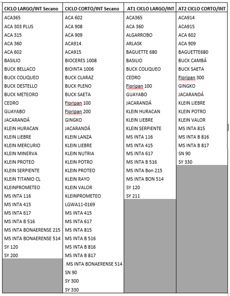 Los cultivares de trigo evaluados se agruparon pr longitud de ciclo en ensayos sembrados en distintas fechas (Tabla 1). Bajo condiciones de secano 30 cultivares de trigo de ciclo largo e intermedios con fecha de siembra 24/05/2018 (Ciclo Largo Secano) y 33 cultivares de ciclo corto e intermedio con fecha de siembra el 18/06/2018 (Ciclo Corto Secano), a una densidad de siembra de 180 plantas/m2 y antecesor soja.