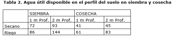 Resulta relevante considerar la disponibilidad de agua almacenada en el suelo en el momento de la siembra de trigo. Este es un factor importante, tanto para la decisión de realizar la siembra como para la expectativa de rendimiento. Se tomaron muestras de suelo al momento de la siembra y la cosecha para analizar la disponibilidad de humedad en el perfil de suelo que se presenta en la tabla 2.