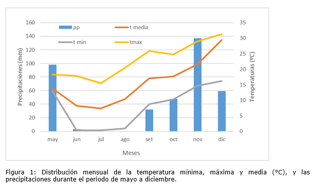 Durante la campaña la temperatura media estuvo entre 15°C y 29°C. Hubo temperaturas mínimas mensuales de 0,3ºC y las máximas alcanzaron los 31,3ºC. Durante los meses de julio y agosto no se presentaron precipitaciones, y posteriormente las mismas fueron aumentado hasta un pico máximo en el mes de noviembre 137mm.