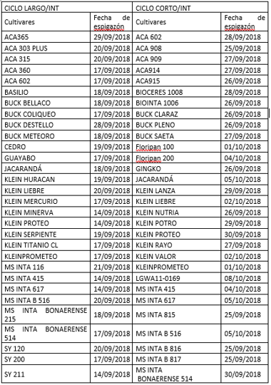 Tabla 4. Fecha de espigazón de los cultivares de ciclos largos, ciclos cortos e intermedios sembrados en secano.