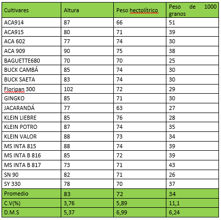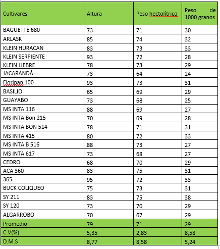 Tabla 6. Altura de la planta, peso hectolítrico y peso de mil granos en cultivares de ciclos cortos e intermedios sembrados bajo riego.