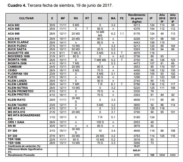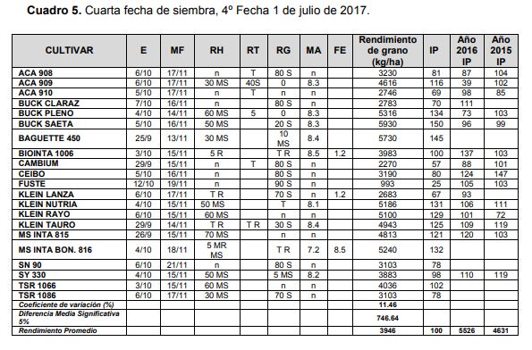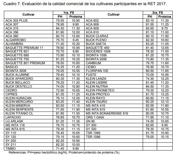 En el Cuadro 7 se presentan los resultados del análisis de calidad comercial de los cultivares de trigo de ciclo largo, intermedio y corto participantes en los ensayos de 1º y 3º fecha de siembra (FS) del año 2017.
