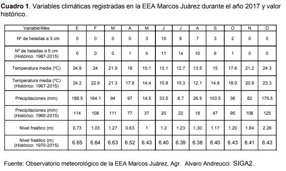 Se registraron en total 31 heladas a 5 cm sobre el nivel del suelo. Estos valores estuvieron muy por debajo del promedio histórico (48), siendo el mes de junio con mayor ocurrencia. Se destacan dos heladas en junio (19/6 -9 ºC y 20/6 -7 ºC) y dos en julio (17/7 -9.8 ºC y 18/7 -6.8 ºC) de intensidad y duración importantes que no afectaron el número de plantas del ensayo. Cuando ocurrieron las heladas de junio, la primera fecha de siembra se estaba sembrando y con las heladas de julio el trigo estaba en inicio de macollaje con alta capacidad de recuperación Luego, durante el mes de julio sólo ocurrieron 6 heladas, valor poco usual para este mes con registro histórico de 14 heladas. Durante los meses de septiembre y octubre ocurrieron heladas de baja intensidad y duración, y no se observaron daños en los órganos reproductivos. Las precipitaciones de agosto y septiembre junto al efecto de la napa freática permitieron afrontar el período crítico para la formación y desarrollo de los granos sin estrés hídrico. El llenado de granos se presentó con óptimas condiciones de temperatura durante casi todo el período, permitiendo alcanzar muy buenos rendimientos de granos.