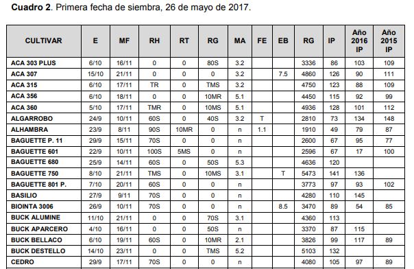Con la finalidad de disponer de información para una mejor elección de cultivares se presentan los resultados agronómicos, fenológicos y de calidad comercial de las variedades participantes en los ensayos de la Red Nacional de Evaluación de Cultivares de Trigo (RET) conducidos en el campo experimental de la EEA Marcos Juárez en el año 2017.