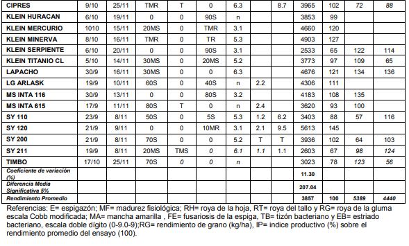 Los ensayos se realizaron en un lote proveniente de la rotación trigo/maíz-maíz-soja de primera, con una fertilización de 180 kg/ha de UREA al voleo en presiembra y 90 kg/ha de Fosfato Monoamónico incorporado al costado del surco en la siembra. La siembra se realizó en forma mecánica bajo el sistema de siembra directa con una sembradora experimental AGROMETAL de siete surcos distanciados a 0,20 metros con cono distribuidor. Los ensayos se condujeron libres de malezas, las cuáles fueron controladas en pre-siembra con una mezcla de Glifosato 48%, Clorsulfurón 62,5% y Metsulfuron metil 12,5%, en dosis comercial. Se utilizó un diseño bloques completos aleatorizados con tres repeticiones con una unidad experimental (parcela) de 5 m2 a cosecha. No se realizó control químico de enfermedades foliares con el motivo de caracterizar el comportamiento sanitario de las variedades evaluadas. Se evaluaron las enfermedades presentes: roya de la hoja (Puccinia triticina), roya del tallo (P. graminis tritici) roya de la gluma o amarilla (Puccinia striiformis) utilizando la escala propuesta por Cobb modificada por Peterson (Stubbs et al., 1986), y la escala propuesta en Rust Scoring Guide (CIMMYT, 1986); mancha amarilla (DT) (Drechslera tritici repentis), fusariosis de la espiga (FE) (Fusarium graminearum) y Tizón bacteriano (TB) (Pseudomonas syringae) y Estriado bacteriano (EB) (Xanthomonas campestris t.) utilizando una escala de doble dígito 0-9 /0-9 (Kohli, 1989), donde 0 es libre de enfermedad y 9 hasta 90% de incidencia y/o severidad.