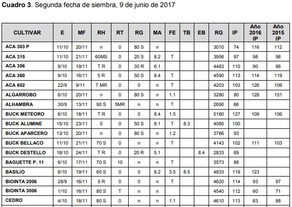 El cultivo de trigo es una alternativa otoño-invernal sustentable para la rotación de cultivos en la empresa agropecuaria, ya que reduce los efectos negativos producidos por excesos y/o déficit hídrico a causa de la variabilidad climática. En la campaña 2017, el cultivo de trigo ocupó a nivel nacional 5.927.610 ha sembradas, un rendimiento promedio de 3181 kg/ha y una producción total de 18.518.045 ton. de grano. En la provincia de Córdoba se implantaron 1.236.318 ha y se cosecharon 4.195.464 ton. de grano, con un rendimiento promedio de 3512 kg/ha. En el Departamento Marcos Juárez se sembraron 162.763 ha las que produjeron 704.462 ton de grano con un rendimiento promedio de 4800 kg/ha. (Ministerio de Agroindustria de la Nación, 2017). A causa de la ocurrencia de epifítias producidas principalmente las royas, como la de la hoja (RH) (Puccinia triticina), del tallo (RT) (P. graminis tritici) durante las campañas 2015 y 2016 y de la gluma (RG) (P. striiformis tritici) durante la campaña 2017, resulta necesario recomendar un cambio de variedades para morigerar los daños y no depender solamente del control químico. Con la finalidad de disponer de información para una mejor elección de cultivares se presentan los resultados agronómicos, fenológicos y de calidad comercial de las variedades participantes en los ensayos de la Red Nacional de Evaluación de Cultivares de Trigo (RET) conducidos en el campo experimental de la EEA Marcos Juárez en el año 2017 (Cuadros 2, 3, 4, 5, 6 y 7).