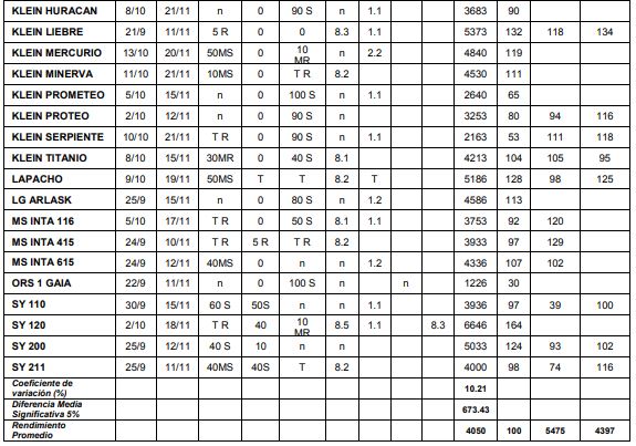 La cosecha de grano se realizó entre el 1/12 y 10/12 cuando los materiales evaluados se encontraban en madurez de cosecha mediante una cosechadora experimental automotriz de parcela chica (Wintersteiger). Los análisis de calidad comercial (proteína y peso hectolítrico) se hicieron con el equipo NIRT en el Laboratorio de Calidad Industrial de Cereales y Oleaginosas de la EEA Marcos Juárez según Norma AACC Nº 39-21 (AACC, 2001) y el peso de mil granos (IRAM 15853), se determinó mediante un contador electrónico de granos. Se realizaron análisis de variancia (ANAVA) y test de comparación de medias LSD de Fisher, para la variable rendimiento en kg/ha dentro de cada fecha de siembra y ensayo. p < 0.05, utilizando el software estadístico Infostat (Di Rienzo et al., 2015). Los ensayos se iniciaron con una muy buena disponibilidad de agua en el perfil del suelo originada con las precipitaciones ocurridas en los meses de verano y otoño (Cuadro 1), destacándose en la mayoría de los meses lluvias por encima del promedio histórico, a la que se sumó la disponibilidad de agua por el nivel freático..