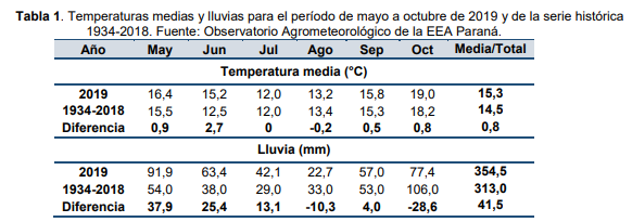 Si bien la temperatura media del período mayo-octubre de 2019 no tuvo grandes variaciones, junio se destacó por presentar 2,7°C más que lo normal. Con respecto a las lluvias, entre mayo y julio, los valores fueron superiores al promedio histórico (Tabla 1).