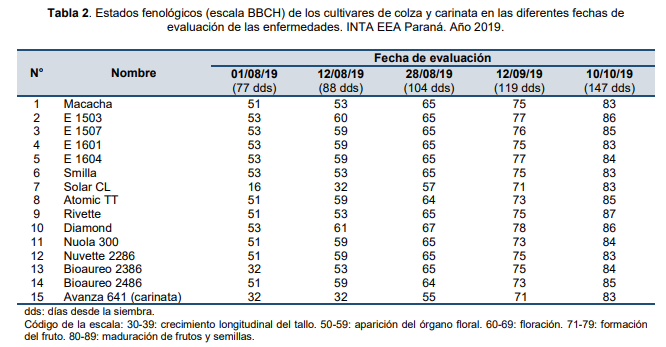 Al inicio de las evaluaciones los cultivares de colza se hallaban en la etapa de aparición del órgano floral, a excepción de Bioaureo 2386 y carinata que se encontraban en la etapa de crecimiento longitudinal del tallo principal o “elongación”, y de Solar CL que estaba en la etapa de desarrollo de hojas o “roseta” (Tabla 2).