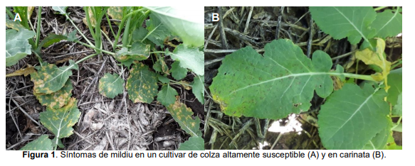 Los síntomas de la enfermedad se manifestaron tanto en los cultivares de colza como en carinata (Figura 1).