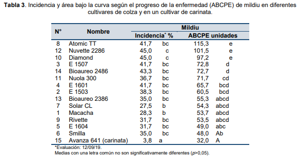 Los registros de incidencia en la última fecha, así como el ABCPE construido a partir de los datos de severidad de las cuatro primeras fechas de evaluación, permitieron discriminar el comportamiento de los cultivares al mildiu (Tabla 3). El cultivar de carinata se destacó por la menor incidencia de la enfermedad y se diferenció del resto. En cuanto a la severidad, la misma alcanzó los grados 3 y 4 (escala 0-5) en los cultivares de colza más susceptibles (datos no presentados); los menores valores de ABCPE correspondieron a carinata y los cultivares Bioaureo 2386, Solar CL, Macacha, Rivette, E 1604 y Smilla, sin diferencias significativas entre los mismos. El mayor número de infecciones ocurre con temperaturas de 8-16°C, elevada humedad relativa (rocío, niebla, llovizna) y baja intensidad de luz, mientras que temperaturas de 23-24°C favorecen el posterior desarrollo del mildiu.