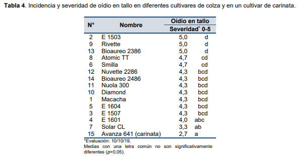 Los ensayos de evaluación de cultivares de colza en la EEA Paraná se caracterizan por la presencia de oídio todos los años, en general con elevados valores de incidencia y severidad a nivel del tallo. Durante el ciclo 2019, la incidencia en los cultivares de colza (datos no presentados) osciló entre 83,3 y 100%, mientras que en el cultivar de carinata fue del 38,3%, diferenciándose significativamente de las primeras. En relación a la severidad, la mayoría de los cultivares de colza superó el grado 4, a excepción de E 1601 y Solar CL quienes no difirieron significativamente del cultivar de carinata; este último registró el menor valor para dicho parámetro (Tabla 4).