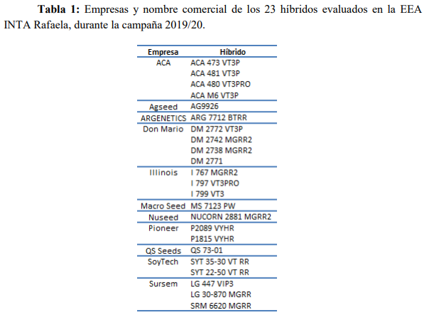 Durante la campaña 2019/20 se evaluaron en EEA INTA Rafaela 23 híbridos de maíz de 11 empresas semilleras. El ensayo fue establecido mediante siembra directa, el 19 de septiembre (Tabla 1), en un lote proveniente de una rotación trigo/soja, sobre un suelo Argiudol típico (Serie Rafaela), con una densidad teórica de 75000 pl ha-1 . El ensayo se condujo en microparcelas de cuatro surcos distanciados a 52 cm y de cinco metros de largo.