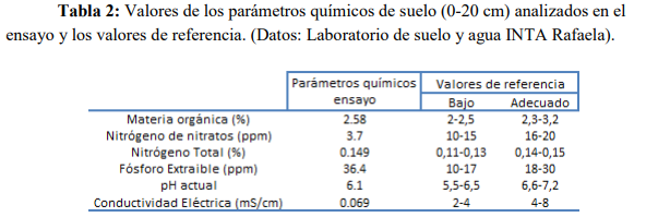 El contenido hídrico inicial del perfil hasta el metro y medio de profundidad fue de 162 mm, lo que representa un 51 % de la capacidad máxima de retención del suelo. Al momento de la siembra el contenido de N-NO3, pH y conductividad eléctrica fueron bajos, el resto de los valores fueron favorables, indicando una adecuada fertilidad potencial (Tabla 2).