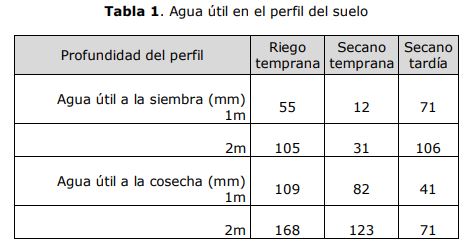 Los ensayos fueron sembrados con escasa agua útil (AU) en el perfil de suelo, aproximadamente menor al 40% (promedio hasta los 2m de profundidad) del AU máxima que es capaz de almacenar este suelo (Tabla 1).
