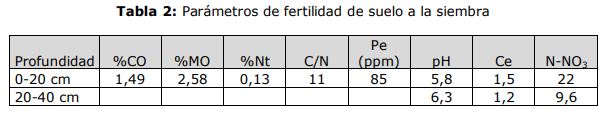 Los análisis de calidad de suelo previos a la siembra, mostraron buen contenido de materia orgánica, moderado contenido de nitrógeno total, buena disponibilidad de N-NO3 y muy buena provisión de fosforo (Tabla 2).