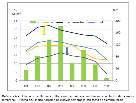 Figura 1. Distribución mensual de precipitaciones, temperatura máxima, mínima y media y radiación durante el ciclo de cultivo 2020/2021 en Manfredi. (Fuente: Agrometeorología EEA Manfredi)