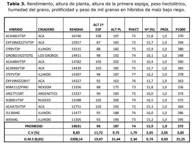 Los híbridos bajo riego no estuvieron limitados mayormente por la oferta hídrica y nutricional, y por lo tanto crecieron en condiciones próximas a su potencial productivo. El rendimiento promedio del ensayo fue de 14031 KgHa-1 , con un rango de 16746 KgHa-1 a 11305 KgHa-1 entre tratamientos. El híbrido de mayor rendimiento fue ACA481VT3P (16746KgHa-1 ). Aunque los cinco híbridos superiores no presentaron diferencias de rendimiento significativas entre sí (Tabla 3).