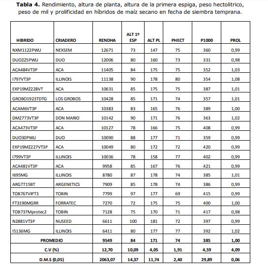 En condición de secano y en fecha de siembra temprana la media de rendimiento de los híbridos fue de 9549 kgha-1 , con un rango de 12671 KgHa-1 a 6411 KgHa-1 . No obstante, los cinco híbridos de mayor rendimiento (Tabla 4) no presentaron diferencias significativas entre sí.