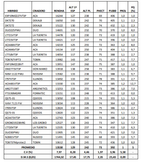Si bien las precipitaciones durante el periodo crítico (febrero) fueron bajas, durante los restantes meses las precipitaciones fueron favorables, y junto al agua acumulada en el suelo, permitieron al cultivo contar con buena disponibilidad hídrica. Cuatro híbridos superiores EXP19MZ227VT3P (ACA), DK7270 y DK7272 (DEKALB) y DUO225PWU (DUO)- integraron un grupo de rendimiento superior en el que difirieron estadísticamente entre sí (Tabla 5).