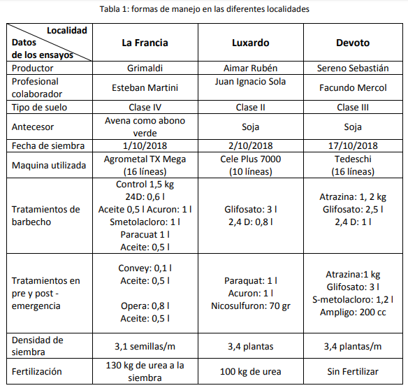 En esta nueva campaña se evaluaron nueve híbridos en tres localidades diferentes. Los productores y asesores que colaboraron con los ensayos para el caso de Devoto y Luxardo pertenecen al programa de Cambio Rural Lecheros, otorgando de esta manera un valor adicional a la generación de esta información. Cabe aclarar que los ensayos realizados se ubicaron dentro de un lote comercial de maíz, siendo además sembrados con la maquinaria provista por el propio productor. Cada parcela tuvo el ancho de la sembradora y un largo de 200 metros aproximadamente. La cosecha de los híbridos se realizó de manera manual, tomándose muestras en tres lugares diferentes dentro de la parcela (5 m2 cada una), realizándose las siguientes tareas: corte y pesaje de plantas, se midió altura de plantas, se contaron plantas y se tomó una muestra para analizar el contenido de materia seca de cada híbrido. En la tabla 1, se presenta información adicional referida al manejo del cultivo para cada localidad en las que se realizaron los ensayos.