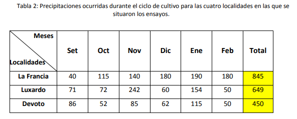 - Las lluvias en esta campaña fueron muy oportunas en cantidad y frecuencia, situación que permitió obtener muy buenos rendimientos, tanto en los ensayos como en lotes comerciales de la zona.