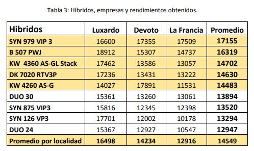 En la tabla 3 se presentan los híbridos evaluados, las empresas a las que pertenecen y los rendimientos obtenidos por cada híbrido y para cada localidad. Cabe aclarar que los diferentes híbridos están ordenados de mayor a menor de acuerdo al rendimiento promedio de las cuatro localidades.