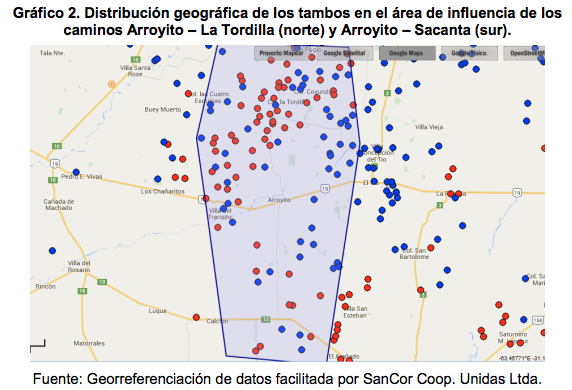 Como punto de partida se tomó contacto con la empresa láctea cooperativa SanCor, que tiene un volumen de captación importante de leche en la región y proporcionó la información de entregas de leche por parte de los productores, así como datos básicos de los tambos. El primer paso que se dio fue un análisis de la situación de captación de leche en lo que podríamos llamar “región de influencia” de estos dos caminos. La cooperativa posee la capacidad de georreferenciar los tambos (propios y del resto de las empresas). Con ayuda de esta tecnología, el primer paso fue ajustar un “área de influencia” de los caminos mejorados, que se estableció en unos 15 km a ambos lados de los mismos y también desde los extremos. Sin embargo, este primer procedimiento no rindió los resultados esperados, porque tal como se observa en el Gráfico 2, en términos aproximados, el 50 % de los tambos están vinculados a SanCor (color azul) y el restante 50 % (color rojo) se distribuye entre varias empresas (Saputo, Noal y La Lácteo son las más importantes, pero hay también varias queserías de menor tamaño).