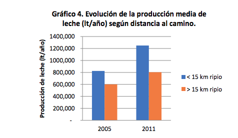 En el Gráfico 4 se muestra la evolución de la producción total de leche (litros por año) de ambos grupos de tambos, apreciándose que, en promedio, los tambos ubicados más cerca de los caminos mejorados tuvieron un desempeño mejor (en términos de mayor producción).