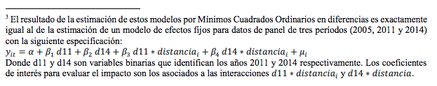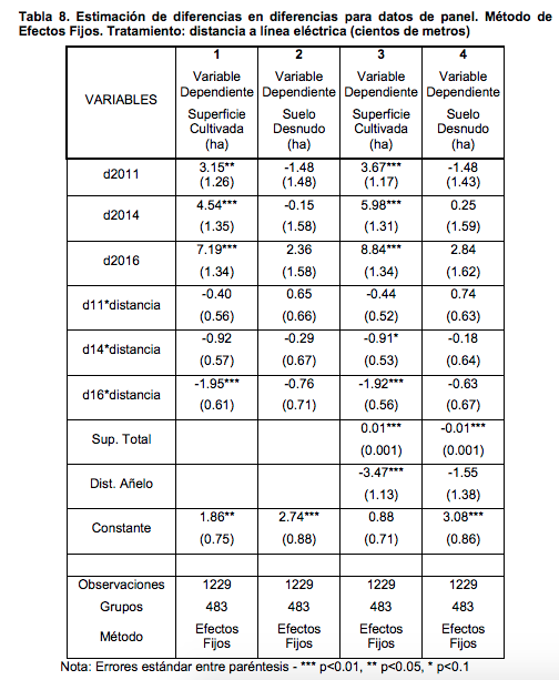 Con los datos de superficie cultivada y superficie con suelo desnudo a nivel de predio como variables dependientes y la distancia a la línea eléctrica como variable de identificación del impacto del proyecto se estimaron diversos modelos para aproximar el efecto cuantitativo y testear la robustez de los resultados. En principio propone un modelo donde la diferencia de la variable dependiente es explicada por el tratamiento definido como la cercanía a la línea eléctrica a una distancia menor o igual a 150 metros6 .
