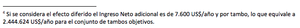 A partir de las estimaciones de impacto sobre los niveles de producción es posible intentar un análisis de impacto en términos económicos a partir de las diferencias de medias entre los tambos ubicados a menos y a más de 15 km de los caminos evaluados. Los resultados muestran que los tambos ubicados a menos de 15 km de los caminos aumentaron su producción, en promedio, entre 198.000 y 208.000 (dependiendo del periodo que se considere). Obviamente, esa producción diferencial consumió recursos adicionales, por lo que no puede considerarse todo como una renta económica extra imputable al pago teórico de la inversión. No se disponen de series de costos de producción, pero es factible intentar un ejercicio “conservador”, suponiendo que el Ingreso Neto (Ingreso bruto menos gastos directos e indirectos y amortizaciones) es similar a un valor mínimo de alquiler de la tierra en esa región, ya que de lo contrario el productor no continuaría en la producción. Ese valor se estima en 600 litros de leche por hectárea y por año, que para un precio medio de 0,3334 US$/litro (período 2009-2015, información del Ministerio de Agricultura, Ganadería y Pesca), implica un valor de 37.207 US$/año por cada establecimiento, y para una producción media de 1.019.835 litros/año, equivale a un valor de 0,0365 US$/litro producido. Entonces, los 198.000 litros/año adicionales que produce cada tambo representan un Ingreso Neto adicional de 7.227 US$/año y por tambo, lo que para 322 tambos que eran la población objetivo, equivale a 2.327.094 US$/año4 . Considerando una inversión de 24.424.877 US$ (UCAR, 2012), ello implica un período de recuperación de la inversión de unos 10 años y medio, que si bien es un poco largo, se trata de una estimación conservadora, toda vez que no toma en cuenta otros beneficios derivados de estas obras.