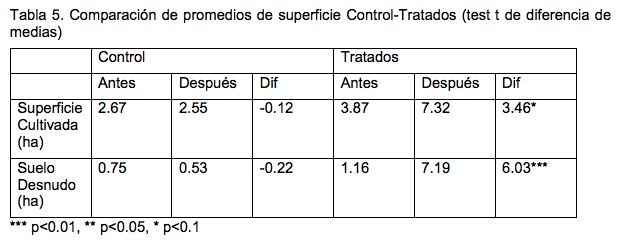 Como se observa, las medias no condicionales son iguales antes de la obra entre los grupos, pero son distintas entre el grupo tratado y control después de la obra. Esto sugiere que antes de la obra ambos grupos eran similares mientras que luego de la obra se incrementó la superficie cultivada y de suelo desnudo comparando entre los productores tratados y no tratados. La Tabla 5 presenta los mismos promedios, pero comparando la diferencia de medias antes y después dentro de cada grupo (tratados y control). Se observa que las diferencias son significativas para el grupo tratado, pero no para el grupo de control. Estas diferencias sugieren similitud entre los grupos antes del tratamiento y un efecto de incremento de superficie cultivada luego del proyecto para el grupo tratado. Sin embargo, esta comparación no permite asignar todo el efecto del cambio a la realización de la obra. Para poder efectuar esta relación causal se recurre a un análisis de regresión que permite controlar tanto por diferencias observables como no observables. En la siguiente sección se presentan los resultados de este análisis.