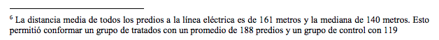 4. En muchos casos, la variable de tratamiento no es binaria sino continua, como por ejemplo en nuestro caso la distancia a la línea eléctrica instalada en el proyecto de estudio. En el caso aquí analizado, se espera que los individuos tengan un impacto inversamente proporcional a la distancia a la línea eléctrica. Es decir, si se incluye como variable independiente de tratamiento la distancia a la línea, el coeficiente de regresión asociado representará el impacto marginal sobre la variable de interés de alejarse una unidad de distancia (cientos de metros en nuestro caso) de la línea eléctrica. A pesar de la naturaleza continua del tratamiento, esta formulación aún retiene las características básicas del modelo DID.
